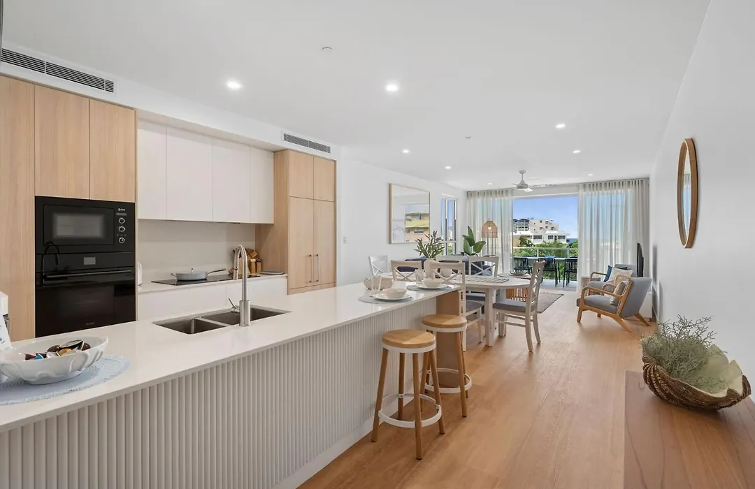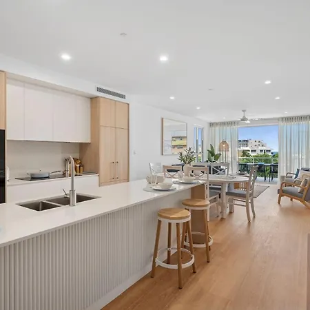 Eine voll ausgestattete Küche mit einer Kaffee-/Teemaschine, einem Kühlschrank und Küchenutensilien gehört zur Ausstattung der Ferienwohnung The Hamptons At Kings für Selbstversorger. Die Bushaltestelle Caloundra ist auch nicht weit entfernt vom Apartment.